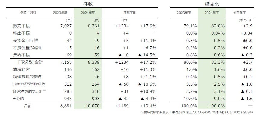 主因別にみると、「販売不振」が8261件(前年度7027件、17.6%増)で最も多く、全体の82.0%(対前年度2.9ポイント増)を占めた。「売掛金回収難」(同44件→49件、11.4%増)や「不良債権の累積」(同15件→16件、6.7%増)などを含めた『不況型倒産』の合計は8389件(同7155件、17.2%増)となった。