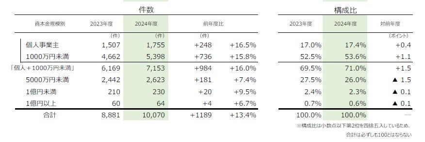 資本金を規模別にみると、『個人+1000万円未満』の倒産が7153件(前年度6169件、16.0%増)発生し、全体の71.0%を占めた。
