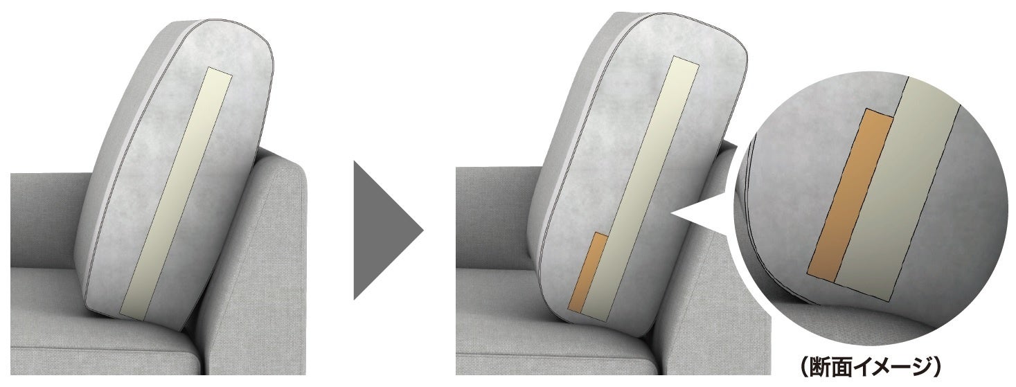 この「CSシリーズ」について、座り心地にさらにこだわり「CS03」としてリニューアルしました。ポケットコイルを使用したフィット感のある座り心地はそのまま、背もたれにウレタンを追加することで、より自然な姿勢をサポートします。