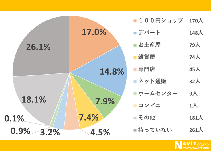 扇子の購入場所をきいてみると、「100円ショップ」で購入したという方が17.0%と1番多く、次に「デパート」が14.8%となっています。続いて「お土産屋」が7.9%となっています。かなり振り幅のある結果になりました。