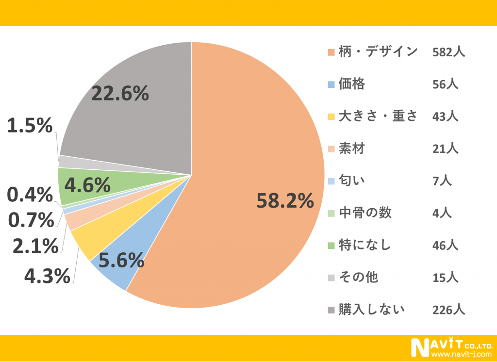 扇子を購入する際に重視するのは「柄・デザイン」という方が多数派で58.2%となっています。やはり夏のおしゃれを楽しむアイテムとして避けて通れないところでしょう。続いて「価格」が5.6%、「大きさ・重さ」が4.3%と続いています。