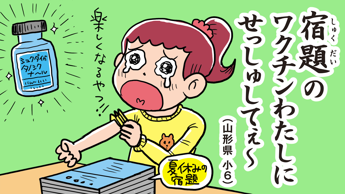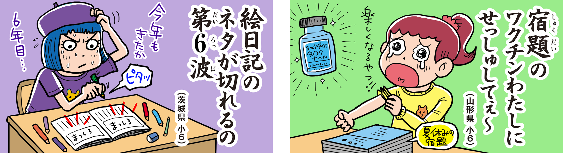 テーマとして最も多かったのは「宿題」で、昨年の18.8%から29.3%に増加し、全体で2580件にのぼりました。夏休みの子どもたちの例年の気がかりとして、宿題の多さを嘆いたり、がんばりたくてもつい後回しにしてしまったりする切実な想いが伝わってきます。