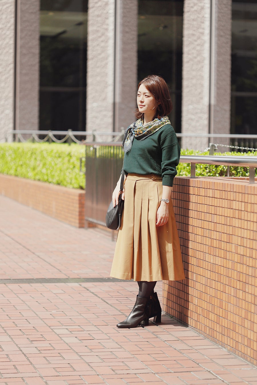 深いグリーンのニットには花柄ストールを合わせて華やかに。ストールは、ニットの色に馴染ませるように取り入れるのがおすすめ。ニット&スカートのシンプルコーデも、小物を+αするだけで素敵見えします。ウエストのベルトデザインを見せるように、ニットをインしてバランスをとって。