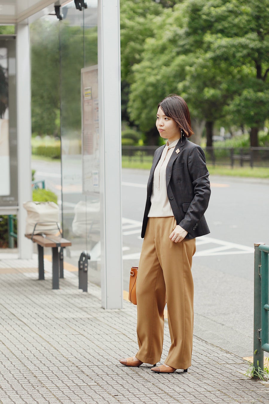 落ち着いたチェック柄のジャケットを合わせた知的な通勤スタイル。トップス&ボトムは、ベージュとキャメルで濃淡をつけて、まろやかな配色の中にも程よいメリハリを。インナーのクラシカルなボウタイニットが顔周りをすっきりと見せてくれます。アクセサリーはネックレスではなく、ラペルにシンプルなブローチをつけてワンポイントに。
