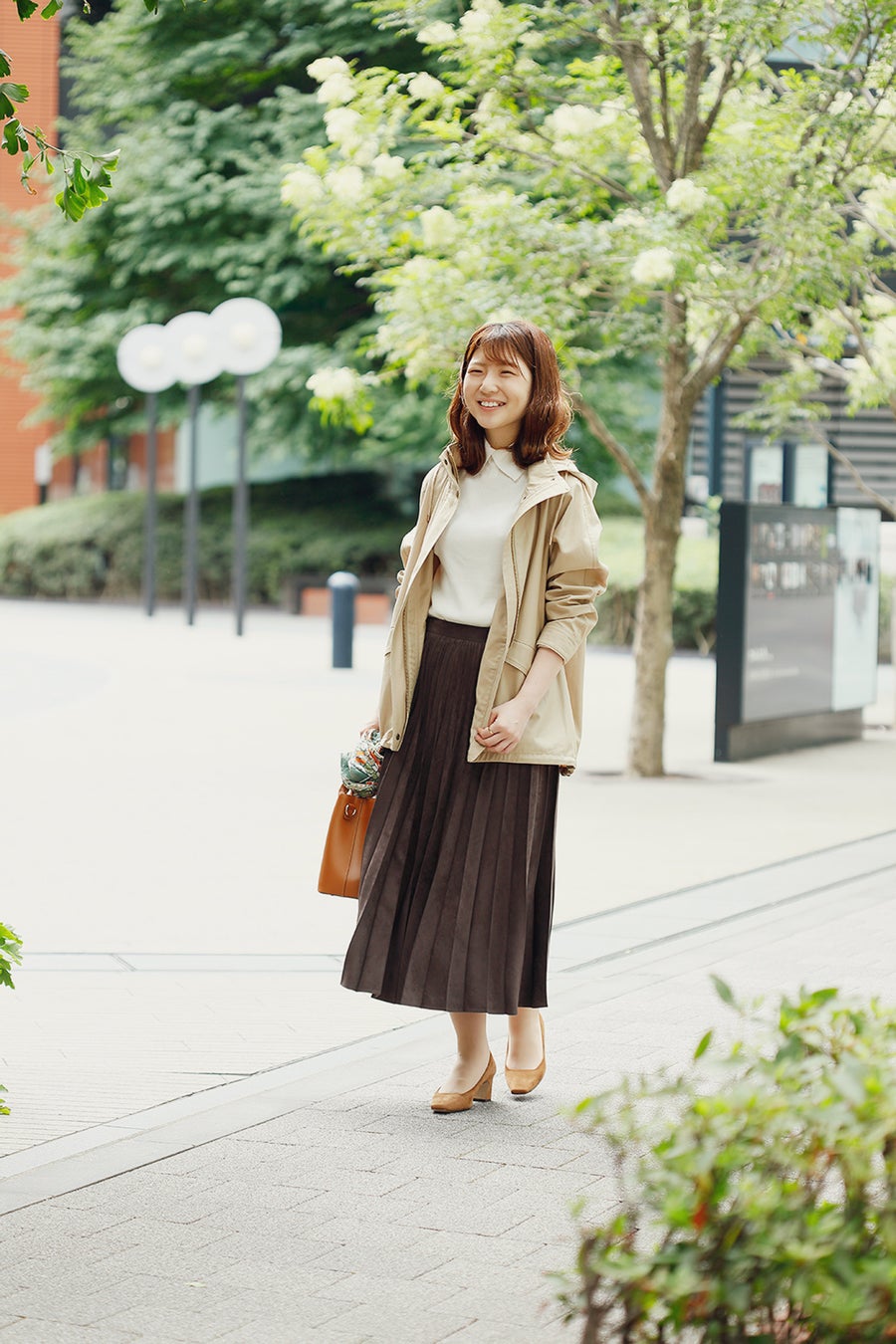 ベージュのコートは、ホワイト&ブラウンを組み合わせたグラデーションコーデに。スポーティーな印象のモッズコートも、襟付きリブニットとプリーツスカートを合わせることで、品のあるカジュアルスタイルになります。裾を絞ってシルエットを変化させると、広がりのあるボトムとも好バランスに。