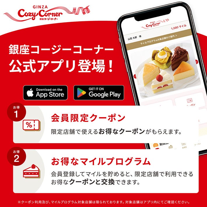 【銀座コージーコーナー】お買い物が便利になって、マイルでお得。最新情報もお届け!銀座コージーコーナー初の公式アプリが7月25日(火)から始まります。
