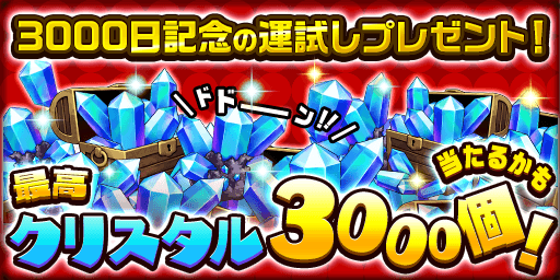 最大で無料召喚100連分のクリスタル3000個が当たる運試しプレゼントを開催。集めるとイベント召喚が出来る3000日記念メダルや、クリスタルがもらえるログインボーナス、無料10連召喚も開催いたします。