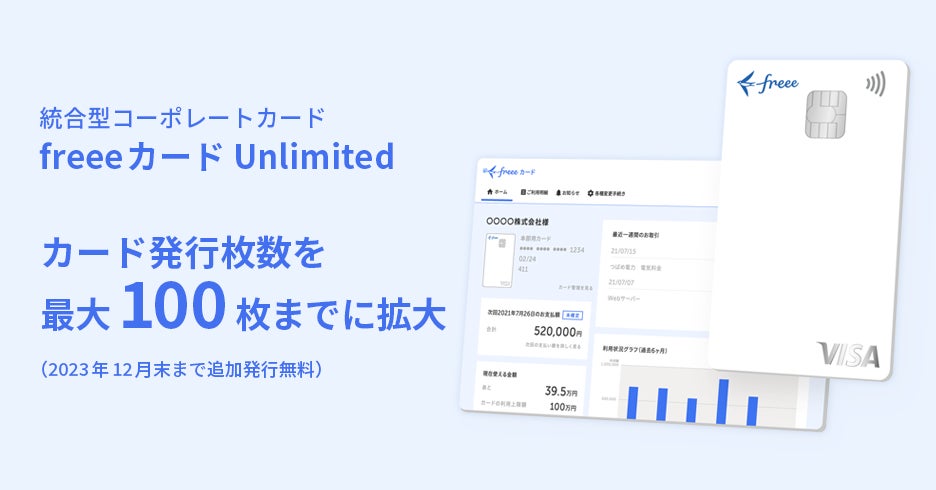 freee finance lab株式会社(本社:東京都品川区、CEO:小村充広)が提供する、法人を対象とした企業成長を支援するための統合型コーポレートカード「freeeカード Unlimited」においてカードの追加発行を最大100枚まで拡大します。