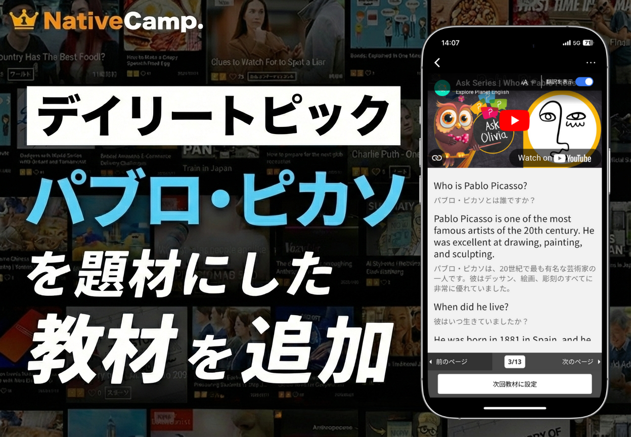 ネイティブスピーカーと回数無制限のオンライン英会話サービス「ネイティブキャンプ英会話」を展開する株式会社ネイティブキャンプ(東京都渋谷区 代表取締役:谷川国洋)は、2026年2月14日(土)、パブロ・ピカソをテーマにした新教材を追加しました。