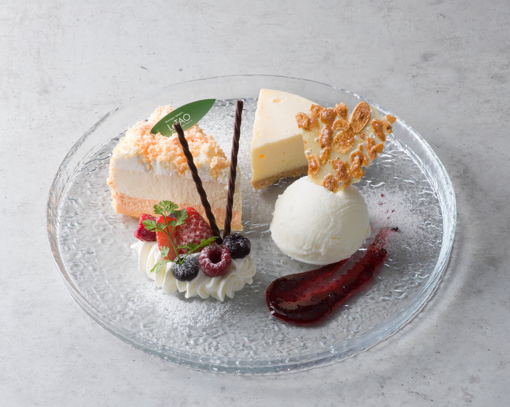 北海道赤肉メロンのふくよかな甘みが広がる夏季限定の「メロンドゥーブル」と、コク深くすっきりとした後味の「ニューヨークチーズケーキ」を一度に楽しめる、ルタオ運河プラザ店限定の一皿。ミルキーなジャージミルクアイスとともにお楽しみください。