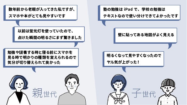 実際に「パソコンくっきり光」「文字くっきり光」搭載のLEDシーリングライトを使用した親世代と子世代に感想を聞いてみたところ、今まで使用していた照明器具と比べ「パソコンくっきり光 」「文字くっきり光」の作業時の見やすさは、「とても見やすい」「見やすい」合計で親世代が99%、子世代が97.1%となり、どちらも95%を超える結果となりました。