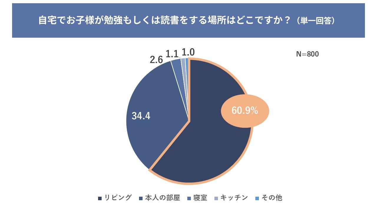 ■自宅でお子様が勉強や読書をする場所は「リビング」が最も多く60.9%を占める。自分の部屋よりもリビングが学習の拠点になっている傾向。お子様がリビングで勉強する理由の半数以上は「親の目が届く範囲で勉強させたいから」