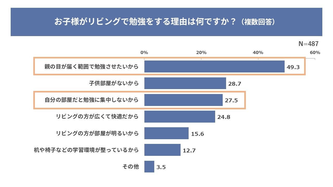 まず、自宅でお子様が勉強もしくは読書をする場所を聞いたところ、最も多いのが「リビング」で、全体の60.9%を占める結果となりました。学習は自分の部屋で行うよりも、リビングで家族と同じ空間にいる中で行うのが主流となっていることがわかります。お子様がリビングで勉強する理由を聞いたところ、「親の目が届く範囲で勉強させたいから」が最も多く49.3%の保護者が選んでいます。また、「自分の部屋だと勉強に集中しないから」も27.5%となっており、家族がいる環境で学習をすることで集中できる場合もあるようです。