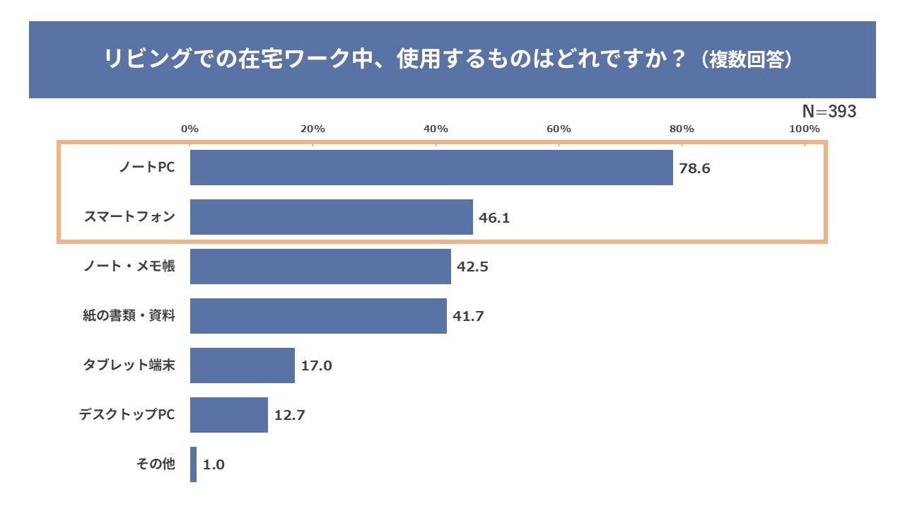 ・リビングで在宅ワークをする際、使用するツールはノートPCが78.6%、続いてスマートフォンが46.1%とパソコンとスマホ画面を見ている方が大半。一方で4割近くの方が「部屋の明るさが足りない」と感じていることが判明。特に「曇りの日」や「夕方以降の作業時」に感じる傾向。