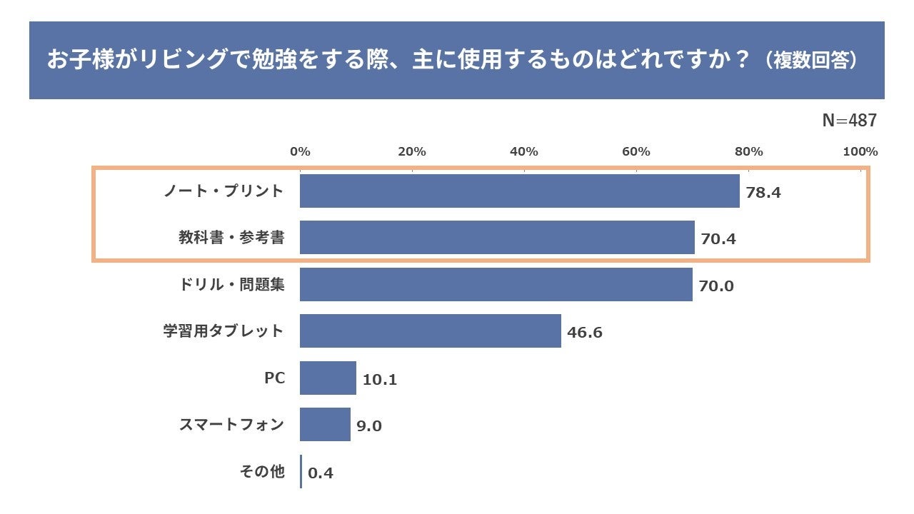 ■お子様がリビングで使用する学習ツールは「ノート・プリント」が78.4%で最も多く、次いで「教科書・参考書」が70.4%。紙に書かれた文字を見る機会が多い傾向
