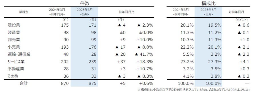 業種別にみると、7業種中3業種で前年同月を上回った。『サービス業』(前年同月202件→239件、18.3%増)が最も多く、「広告・調査・情報サービス」(同67件→91件)の増加が目立った