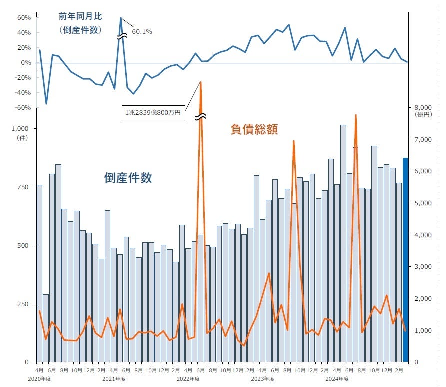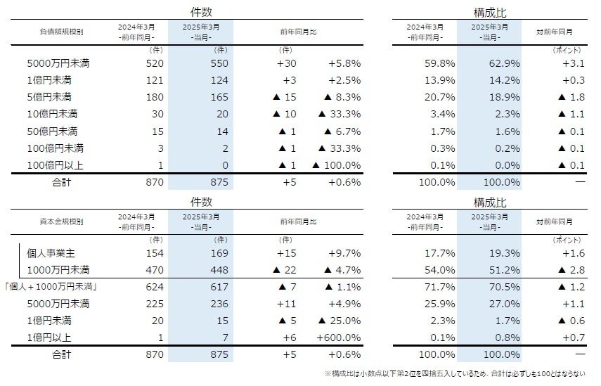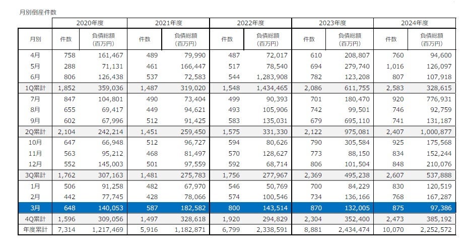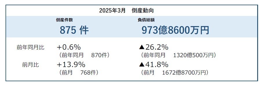2025年3月の企業倒産は875件、35カ月連続で前年を上回り戦後最長を更新 3月としては3年連続の増加 ― 全国企業倒産集計2025年3月報