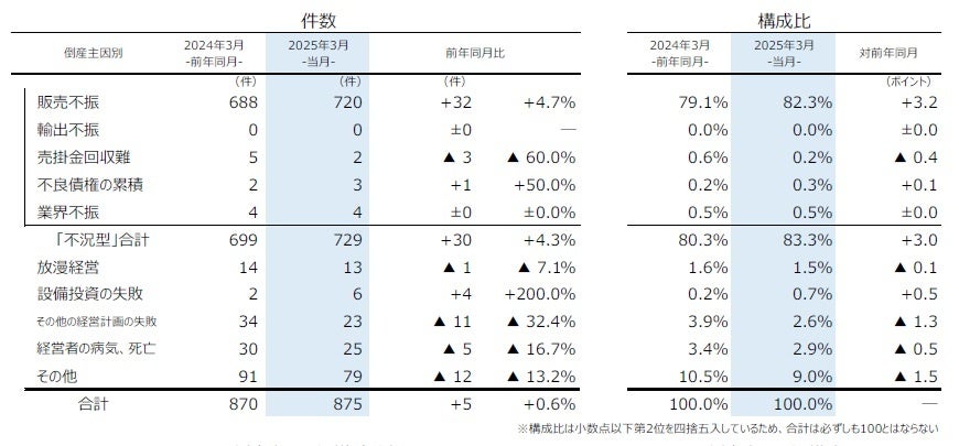 主因別にみると、「販売不振」が720件(前年同月688件、4.7%増)で最も多く、全体の82.3%(対前年同月3.2ポイント増)を占めた。「不良債権の累積」(前2件→3件、50.0%増)や「業界不振」(同4件→4件)などを含めた『不況型倒産』の合計は729件(同699件、4.3%増)となり、35カ月連続で前年同月を上回った。