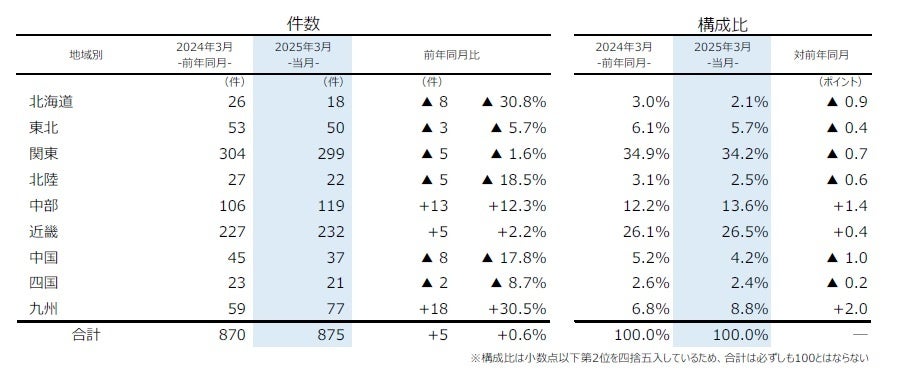 地域別にみると、9地域中6地域で前年同月を下回った。『関東』(前年同月304件→299件、1.6%減)が最も多かったものの、前年を下回った。『北海道』(同26件→18件、30.8%減)は、3月としては2020年(12件)に次いで2番目に少ない件数となった