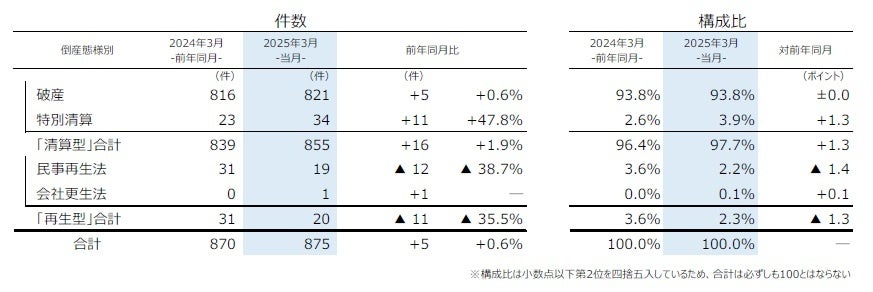 倒産態様別にみると、『清算型』倒産の合計は855件(前年同月839件、1.9%増)となり、全体の97.7%(対前年同月1.3ポイント増)を占めた。『再生型』倒産は20件(同31件、35.5%減)発生し、2カ月ぶりに前年を下回った。