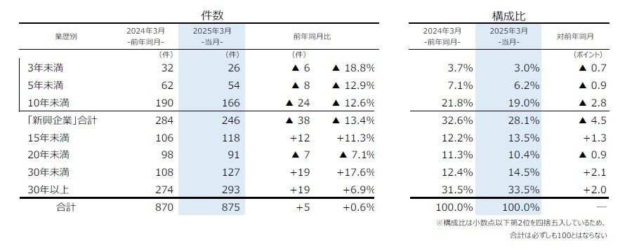 業歴別:業歴10年未満の『新興企業』は246件、3年1カ月ぶりに前年を下回る