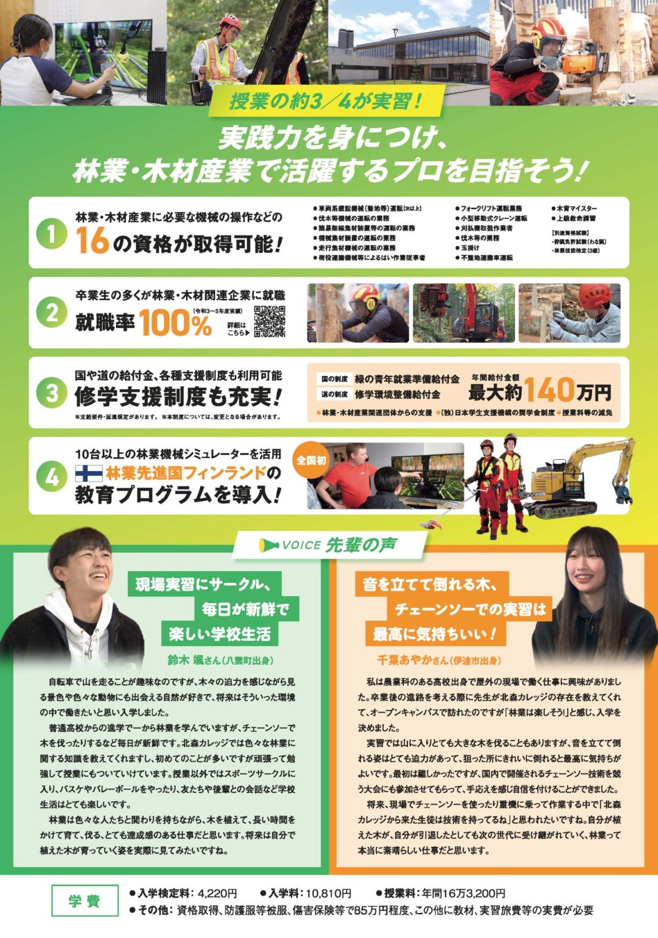 北森カレッジでは、道内各地域の特徴ある森林を活用した実践的な教育を受けることができ、全国で初めて林業先進国フィンランドの林業専門学校との教育連携により、最先端の高性能林業機械のシミュレータを活用した操作実習や、フィンランドとの研修(希望制)などの独自のカリキュラムにより、即戦力となり将来、企業の中核を担う人材の育成に取り組んでいます。