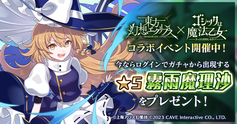 コラボイベント期間中にログインした全プレイヤーを対象に、『東方幻想エクリプス』コラボ使い魔である★5「霧雨魔理沙」がもらえるログインボーナスを開始いたしました。