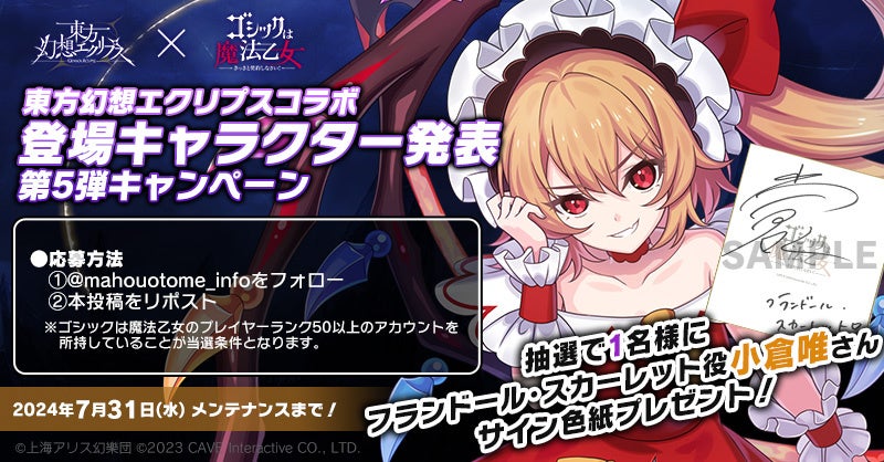 『東方幻想エクリプス』コラボイベント開催を記念して、博麗霊夢役「ファイルーズあい」さん、霧雨魔理沙役「伊瀬茉莉也」さん、十六夜咲夜役「加隈亜衣」さん、レミリア・スカーレット役「竹達彩奈」さん、フランドール・スカーレット役「小倉唯」さんのサイン色紙プレゼントキャンペーンを実施中です。