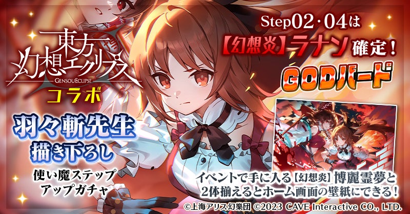 オリジナル二次創作ストーリーをお楽しみいただけるコラボ記念イベントや、羽々斬先生の描き下ろしイラストを含むコラボ使い魔が獲得できるガチャの他、コラボ使い魔★5「霧雨魔理沙」がもらえるログインボーナスや出演声優のサイン色紙が当たるXキャンペーンなども実施中ですので、あわせてお知らせいたします。