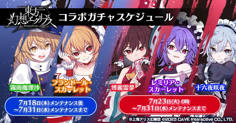 7月23日(火)からは、博麗霊夢、レミリア・スカーレット、十六夜咲夜のガチャが登場予定です。