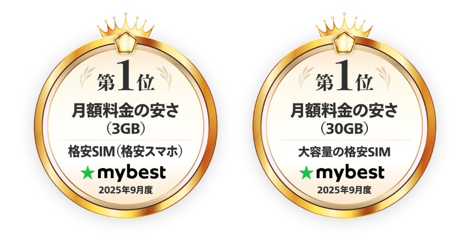 ※ マイベスト月間アワード - 大容量の格安SIM 月額料金の安さ(30GB)2025年9月度