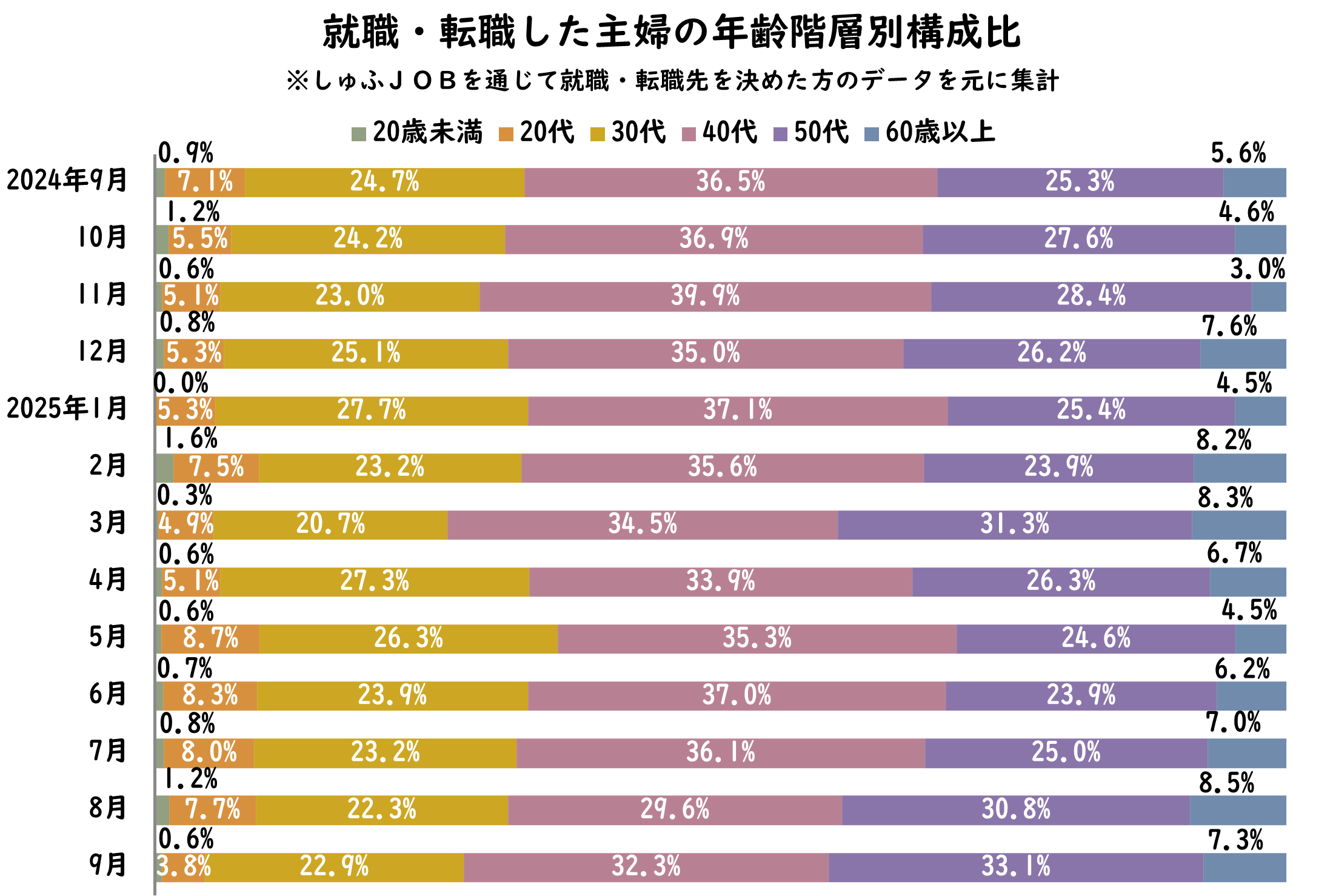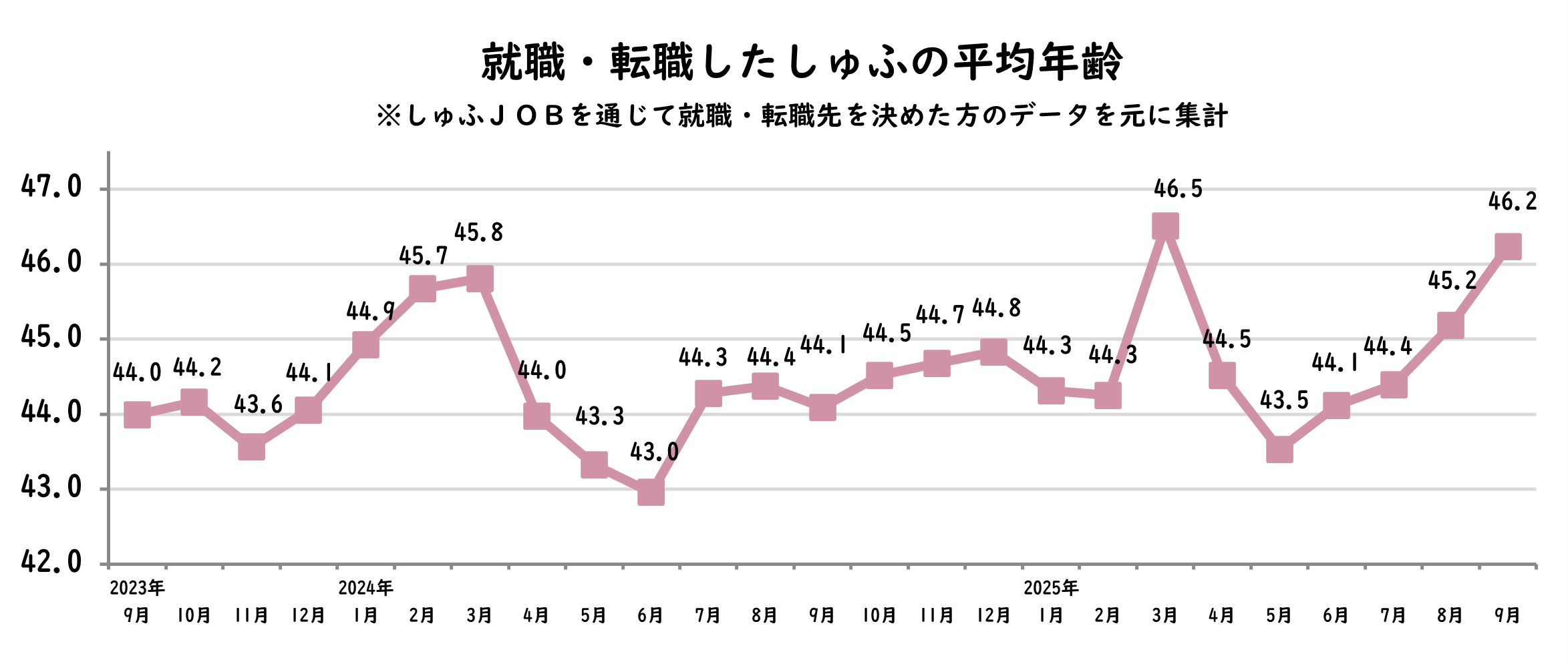 【転職しゅふの平均年齢調査 2025年9月】46.2歳(前月比+1歳)