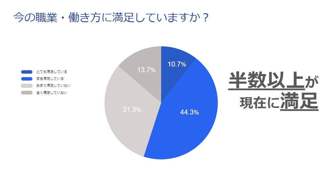 10.7%が「とても満足している」44.3%が「まあ満足している」と回答し、全体の半数以上が現在の職業・働き方に満足しているという結果になりました。