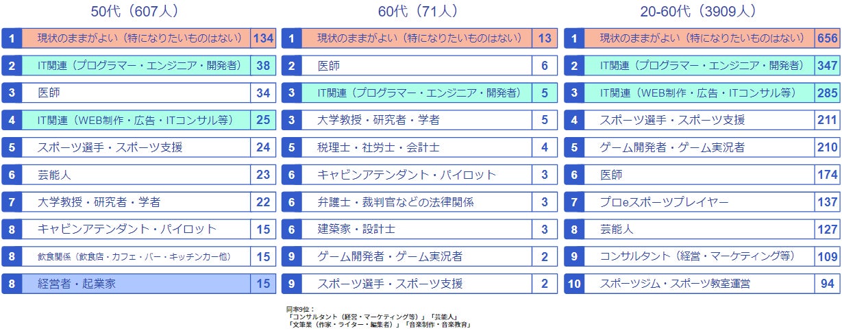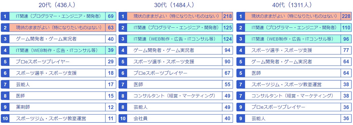 20代以外の年代で「現状のままがよい(特になりたいものはない)」が1位でした。20代はIT関連(プログラマー・エンジニア・開発者)が最も人気という結果となりました。
