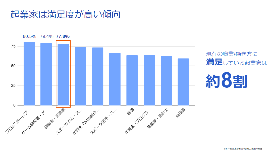 ・「今の仕事に満足しているか」という問いに対して「とても満足している、まあ満足している」と回答した起業家は77.8%で全体の3位、起業家の満足度は高い傾向にあることがわかりました