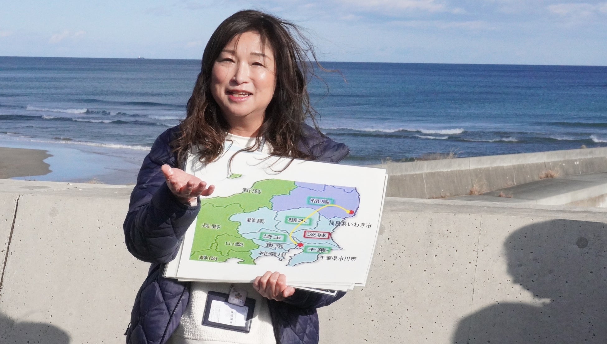 語り部ガイドの猪狩輝美さんは、車窓から見える富岡町のようすを案内しながら震災体験を語り、参加者は地域の事故前と現状の課題への理解を深めました。猪狩さんは、津波で自宅が流され家族で避難した経験を語り「今は離れた地で暮らしていますが、元気なうちに富岡町に戻りたいです。今後も命を守る行動を伝えていきます」と抱負を述べました。