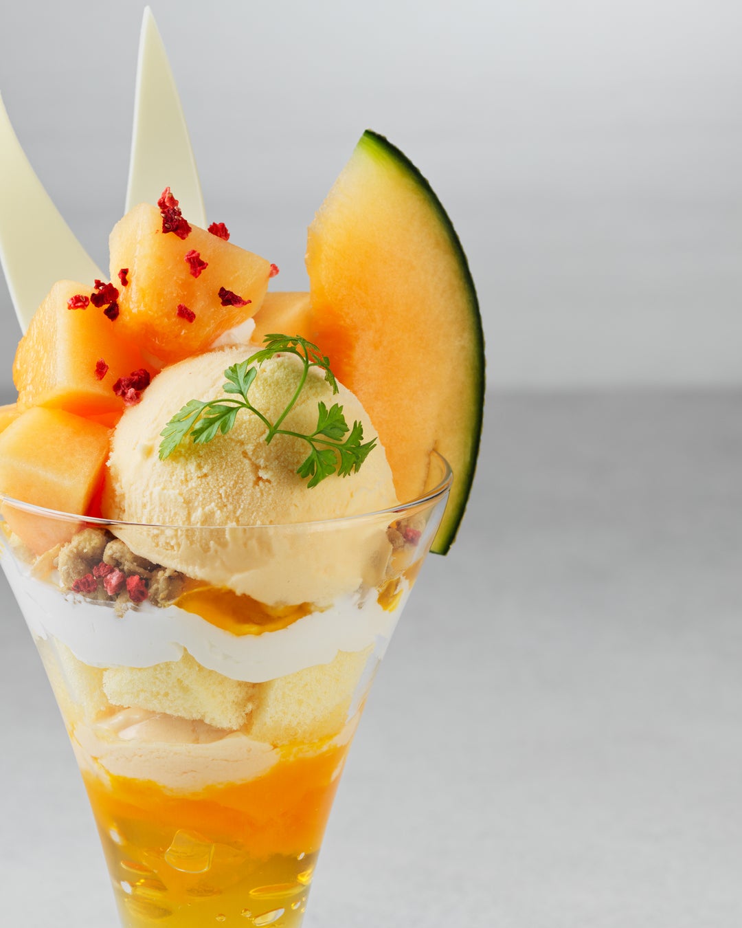 芳醇な北海道産メロンとメロンアイスからはじまり、食感のアクセントとしてグラノーラをトッピング。