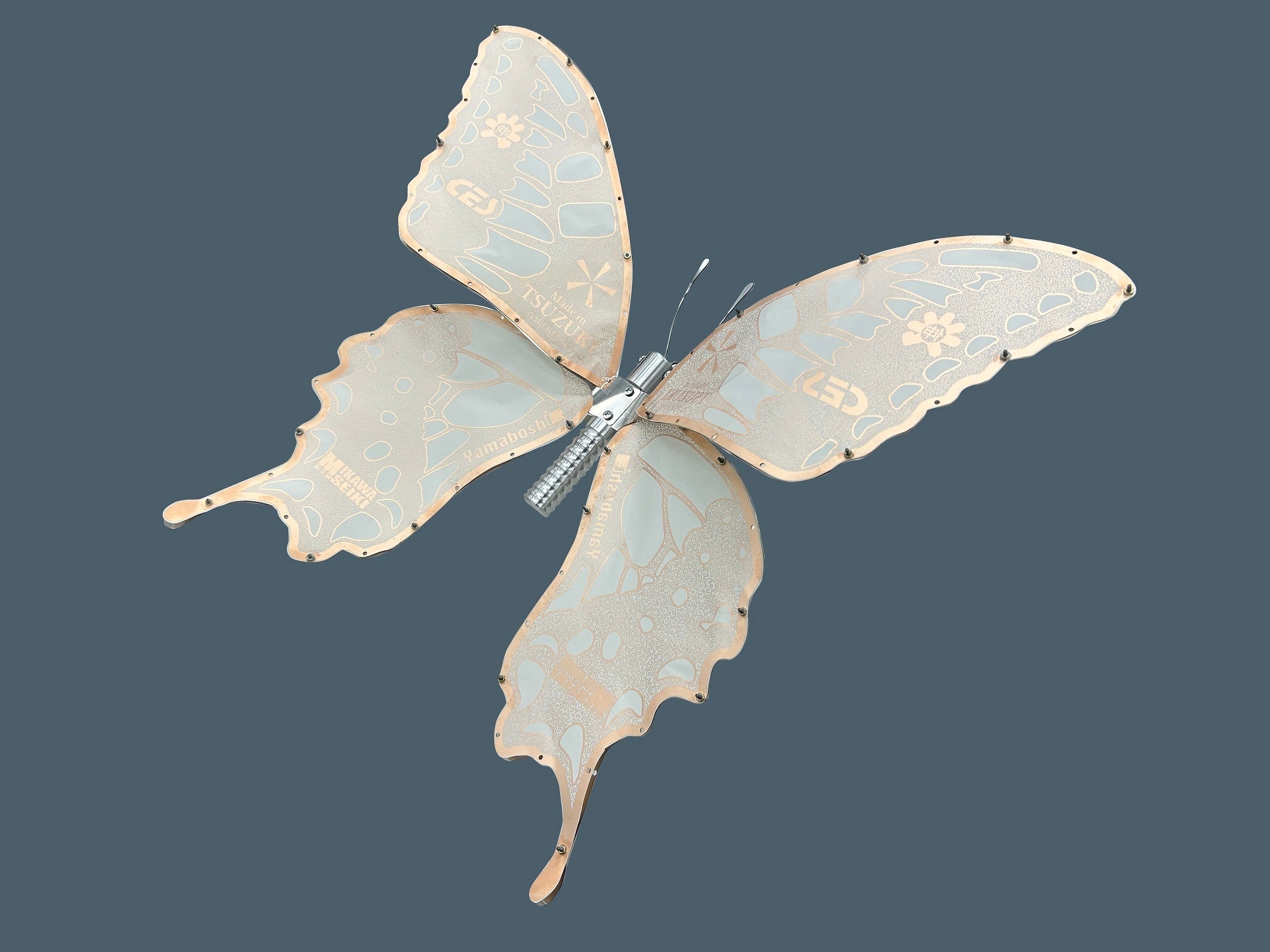 光が透ける極薄素材と銅箔の美しさを魅せる為、翅には細かく複雑な唐草模様をデザイン。