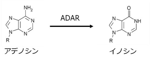 注3)A-to-I編集:RNA中のアデノシン(A)がイノシン(I)に変換される化学修飾。生体内の酵素ADARが担い、イノシンは細胞内で多くの場合グアノシンとして読み取られる。