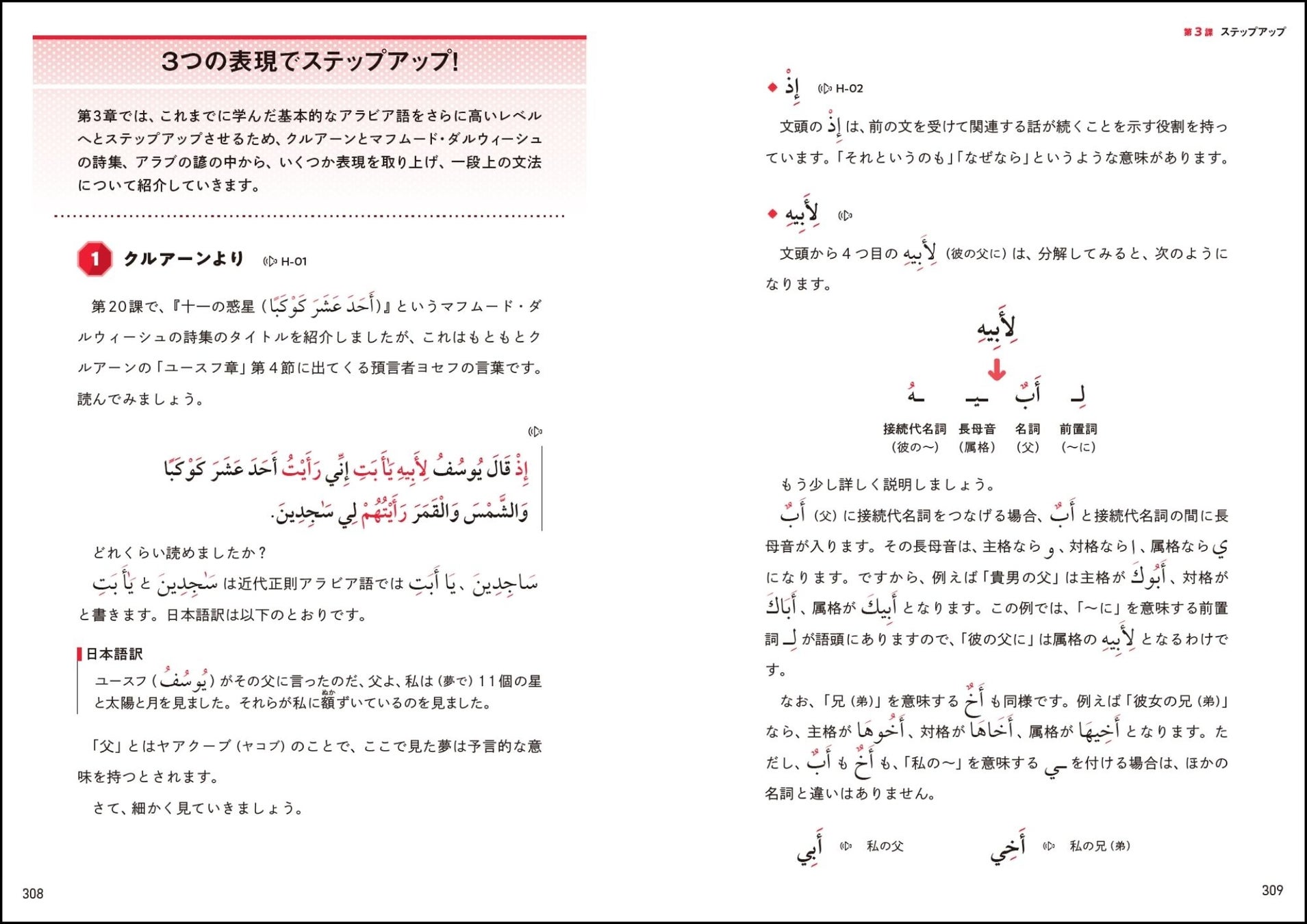 第3章はステップアップ編。「クルアーンをアラビア語で読んでみたい」という多くの学習者の要望に応え、クルアーンの一部を解説します。そのほか、有名な詩やことわざなどの紹介を通してアラビア語の多様な表現にふれながら、ステップアップに必要なポイントを解説します。