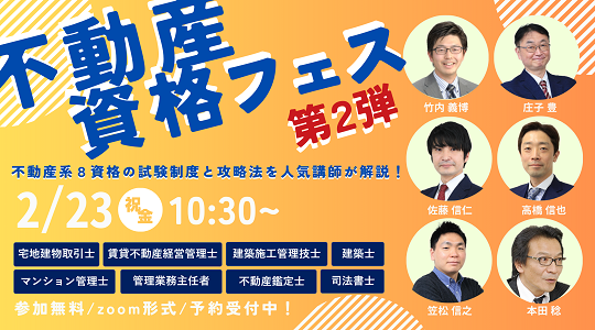 【不動産資格フェス 第2弾】不動産系の人気資格8つの試験制度と攻略法がわかる!2/23(祝・金)10:30~無料オンラインセミナー開催!