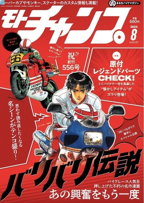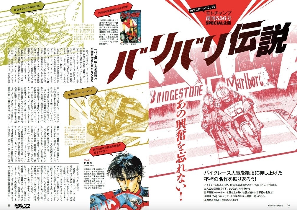 なぜ556号でバリバリ伝説なのか? それは主人公の巨摩郡がWGPで使用していたゼッケンが56番だったから……という語呂合わせ的なつながりだけではありますが、1980~90年代にバイク人気を高めた名作として知られるバリバリ伝説は今も根強いファンが多く、モトチャンプ読者の世代にジャストマッチしています。