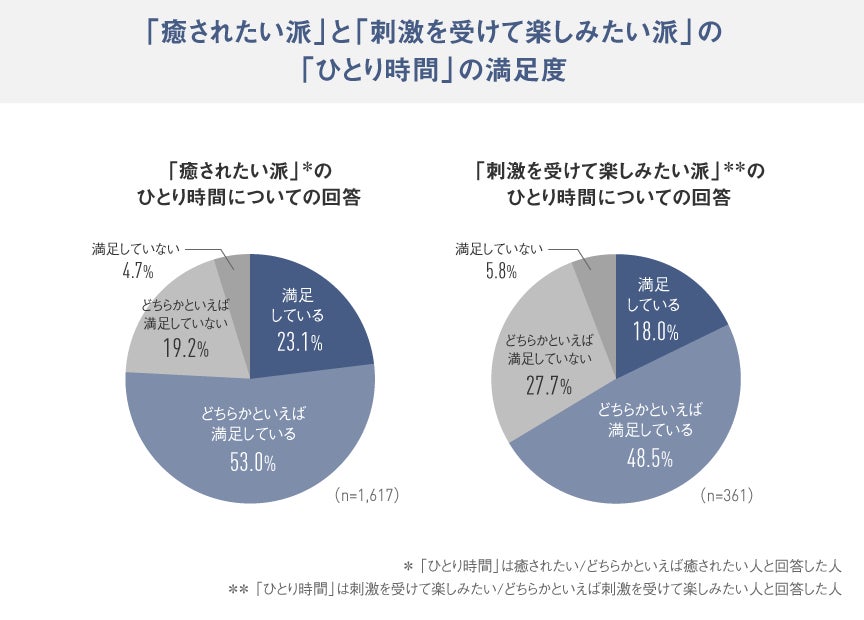 さらに、癒しを重視している人の「ひとり時間」の満足度は76.1%にのぼり、刺激を受けて楽しみたい派の66.5%よりも高い結果になりました。リラックスした時間を過ごすことが、「ひとり時間」の質を求める重要なファクターとなっていることがわかります。