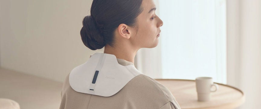 肩にはおるだけの高周波治療器。読書しながら、動画を見ながら、肩こりが改善できます。三宅香帆さんも「肩こり系のガジェットはかなり試してきましたが、コリコランワイドは装着がラクでお気に入りの上位です」と語る。