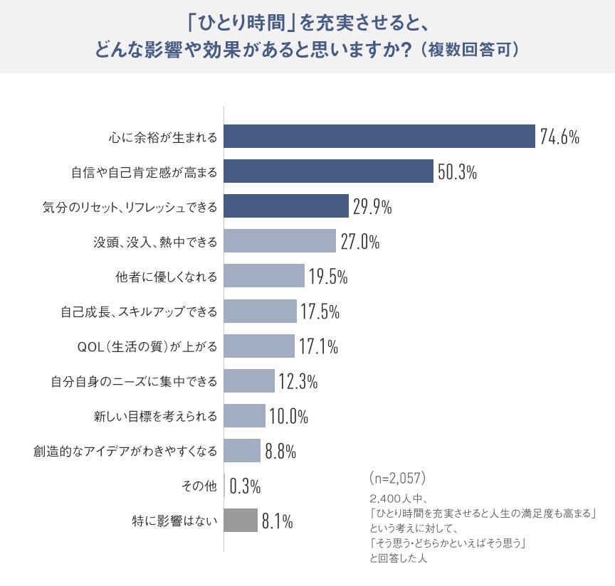 さらに同調査では、「ひとり時間」を充実させることによる影響や効果についても調査しました。すると、「心に余裕が生まれる」「自信や自己肯定感が高まる」「他者に優しくなれる」といった心理的影響を示すものが目立ちました。こうした結果から、癒しの「ひとり時間」を過ごすことで、身体が回復するだけでなく、心のゆとりにもつながることが分かりました。