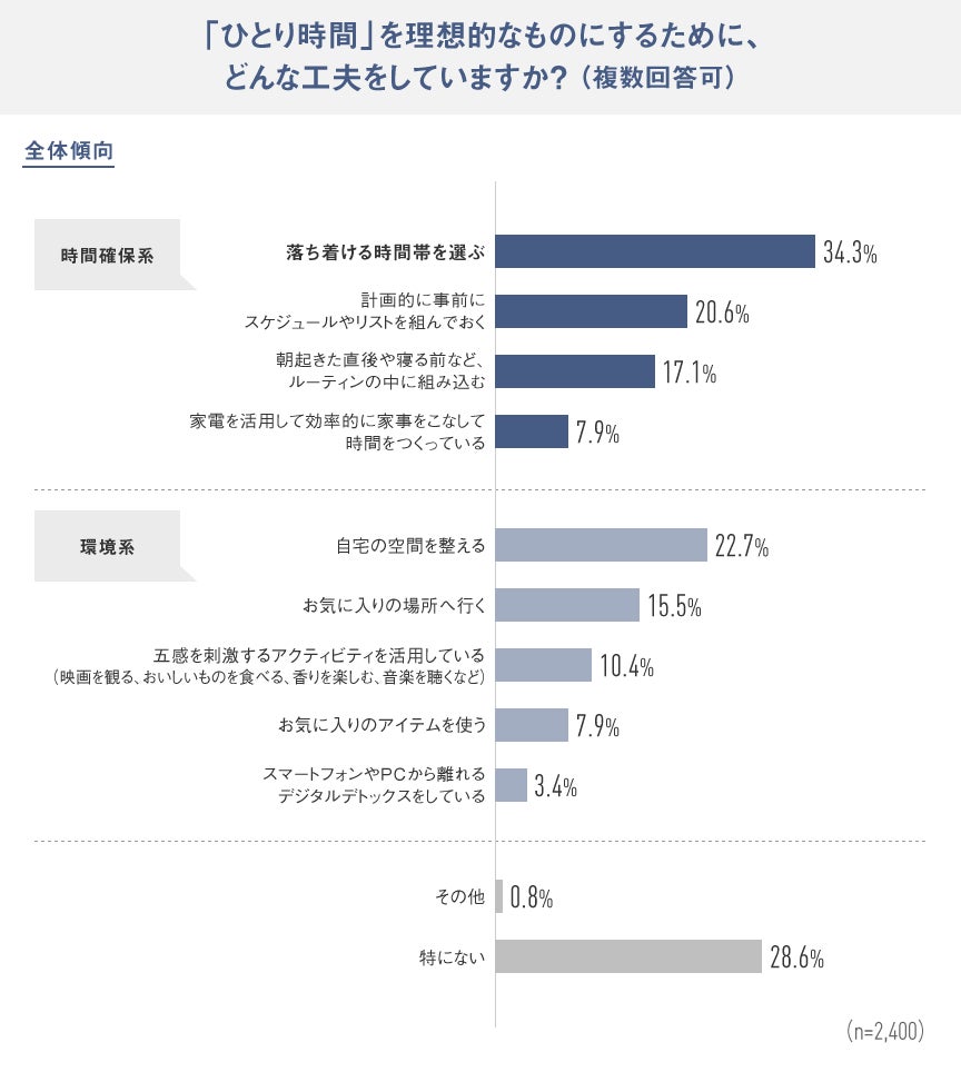 「ひとり時間」を理想的なものにするために行っている工夫については、「落ち着ける時間帯を選ぶ」「計画的にスケジュールに組み込む」「自宅の空間を整える」といった回答が上位にあがりました。忙しい毎日を送りながらも、時間と環境の側面から工夫して「ひとり時間」を確保し、毎日のルーティンに組み込む姿が浮かびます。