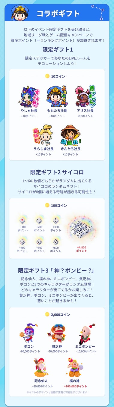 今回の「地域リーグ戦」は、初めての「桃鉄」シリーズとのコラボLIVEイベントであり、ゲームでおなじみのキャラクターやサイコロをモチーフにしたコラボギフトが登場します。「記念仙人」や「貧乏神」等、どのキャラクターがでてくるかわからないランダムギフトもあり、「貧乏神」がでるとポイントが入らないこともあります。上位チームかつ入賞者にはTikTok LIVEと桃鉄のコラボグッズなど豪華特典をプレゼントします。
