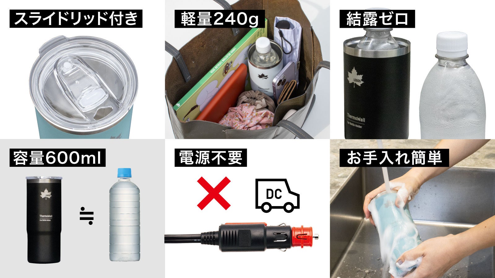 付属のスライドスリッド(蓋)を装着すれば、約600mlの高性能タンブラーとして使用可能。ドリンクホルダーとタンブラーの2WAY仕様で、シーンに合わせて使い分けできる。重量もわずか240gと軽量で、バッグに入れても持ち運びラクラク。真空断熱構造により結露が発生しにくく、バッグの中が濡れる心配なし。電源不要でいつでも使用できるほか、食器用洗剤で丸洗いでき、お手入れも簡単。
