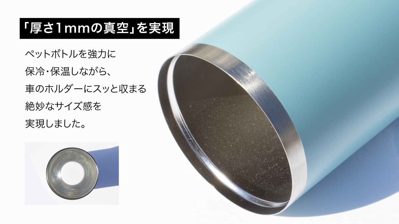 厚さ1mmの超薄型真空断熱構造のため、ペットボトルをしっかりカバーしながら、車の純正ドリンクホルダーにすっきり収まるサイズ感を実現しました。600mlのペットボトルを入れるとぴったり収まり、隙間なく冷気を閉じ込めることで高い保冷力を発揮します。別売りの「氷点下パック・コンパクト」を底部にセットすることで、さらに高い保冷能力を実現できます。