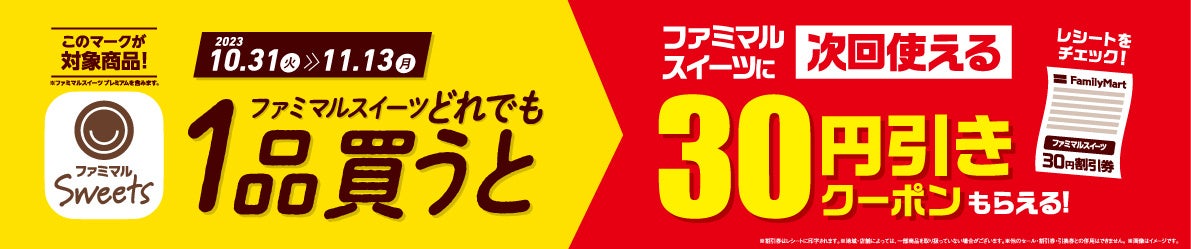 10月31日(火)から11月13日(月)までの期間中、ファミマルSweetsのマークがついた商品をどれでも1品ご購入いただくと、次回会計時でファミマルSweetsに使える30円引きクーポンがもらえるキャンペーンを実施します。クーポンを利用し、おトクにファミマルSweetsをお楽しみください。